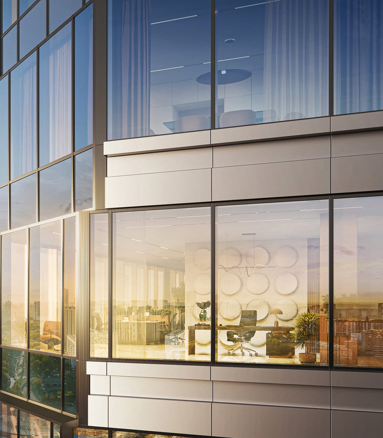 башни имеют выразительный кристаллообразный силуэт с парящим эффектом за счет сужения к верхней и нижней частям. Безупречно ровная поверхность стеклянных фасадов с зеркальным отражением практически
